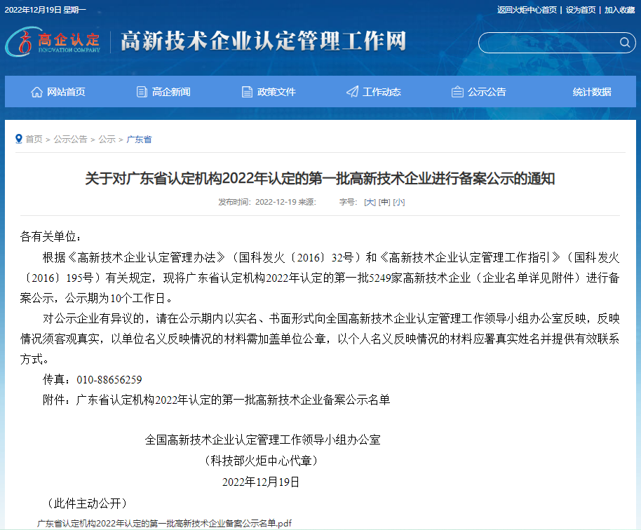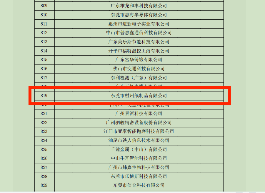 根據(jù)《高新技術企業(yè)認定管理辦法》(國科發(fā)火〔2016〕32號)和《高新技術企業(yè)認定管理工作指引》(國科發(fā)火〔2016〕195號)有關規(guī)定,現(xiàn)將廣東省認定機構(gòu)2022年認定的第一批5249家高新技術企業(yè)(企業(yè)名單詳見附件)進行備案公示,公示期為10個工作日。廣東財州科技有限公司(原名:東莞市財州紙制品有限公司)名列其中。